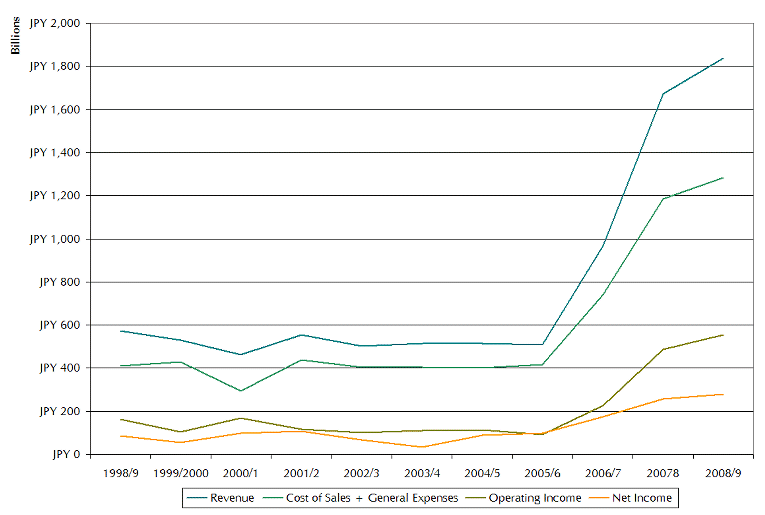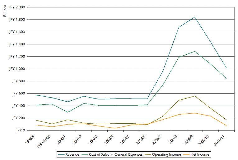 Ah. Now we’ve got a problem. Nintendo’s revenue has been dropping off a cliff for the past few years and net income is back to pre-Wii and DS levels. So even though Nintendo are turning over more than twice as much money as they were in 2004/5 (1,014 Billion JPY vs 508 Billion JPY), their profit levels are actually worse than 2004/5 (77.6 Billion JPY vs 98.4 Billion JPY). You would normally expect to see profit increase relative to revenue, all other things being equal, as products are made more cheaply or more effectively and companies engineer out expense by replacing expensive hardware with less costly alternatives, but because the Wii was already a streamlined product at launch, it must have proved difficult to take out more cost. It could be that it is actually becoming more expensive to make the Wii, as older chips are no longer mass-produced for other non-Nintendo products, reducing the significant economies of scale in chip production.